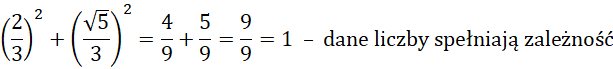 Jeżeli wartościami funkcji sinus i cosinus tego samego kata ostrego α mogłyby być podane liczby to muszą one spełniać zasadę jedynki trygonometrycznej, więc sprawdzamy: