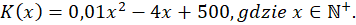 W tym zadaniu musisz obliczyć, ile trzeba wyprodukować detali, aby koszt produkcji był najmniejszy. Zależność między kosztem całkowitym produkcji K liczbą x wyprodukowanych detali określona jest wzorem