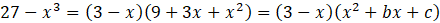 Aby rozwiązać zadanie zapisz prawą stronę danego równania w postaci iloczynowej za pomocą wzoru skróconego mnożenia na różnicę sześcianów. Następnie przyrównaj do siebie wyrażenia nawiasach (9 + 3x + x2 i x2 + bx + c) – aby wielomiany były równe, odpowiadające sobie współczynniki muszą mieć równe wartości. Ustal współczynniki, dla których te równości są spełnione.