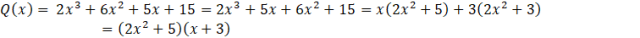 Aby rozłożyć wielomian na czynniki, zamień jego wyrazy kolejnością w taki sposób, by pierwszy znalazł się obok trzeciego, a drugi obok czwartego. Następnie w odpowiednich parach wyłącz przed nawias wspólne czynniki. Z całego wyrażenia wyłącz czynnik 2x2 + 5. Czynnika tego nie da się rozłożyć na czynniki stopnia pierwszego, ponieważ jego wyróżnik jest ujemny.