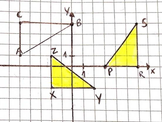 Pozycję punktu w układzie współrzędnych opisujemy dwoma zmiennymi: pierwsza wartość w nawiasie odpowiada wartości pozycji na osi poziomej x, a druga odpowiada wartości pozycji na osi pionowej y. Co do drugiej części zadania, trójkąty posiadają trzy cechy przystawiania: