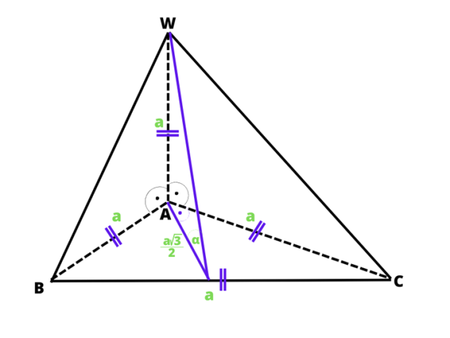 W tym zadaniu musisz narysować ostrosłup ABCW i zaznaczyć kąt α nachylenia ściany BCW do płaszczyzny podstawy, jeśli krawędź boczna AW jest wysokością oraz |AW| = |AB| = |BC| = |CA|.