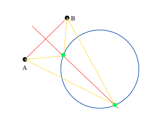 W tym zadaniu musisz odnaleźć punkty na okręgu, których odległość od punktów A i B jest taka sama.
