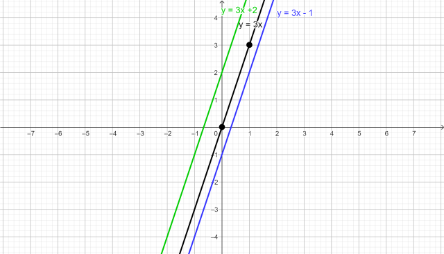 Wykresy funkcji liniowych y = 3x, y = 3x – 1, y = 3x + 2 narysuj w jednym układzie współrzędnych.