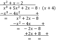 Skoro liczba a jest pierwiastkiem wielomianu w, to dzieli się on przez dwumian x - a bez reszty. Dokonujemy dzielenia przez ten dwumian w następujący sposób. Pierwszy od lewej wyraz wielomianu kwadratowego dzielimy przez pierwszy wyraz podanego dwumianu. Następnie mnożymy go przez dzielnik x + 4 i wynik podpisujemy pod dzielną i odejmujemy go od niej poprzez dodanie wielomianu o przeciwnych współczynnikach. Otrzymujemy pierwszą resztę z dzielenia w ten sposób. Powtarzamy opisaną procedurę, dopóki nie otrzymamy wielomianu stopnia niższego niż dwumian, przez który dzielimy. Następnie wyznaczamy miejsce zerowe trójmianu kwadratowego Korzystając z delty. Przestawiamy wielomian w postaci czynników nierozkładalnych zapisując w funkcji kwadratową w postaci iloczynowej.