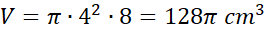 Zauważ, że przekrój osiowy walca jest prostokątem, którego bokami są średnica podstawy i wysokość bryły. Na tej podstawie oblicz jego wysokość i promień, a następnie skorzystaj ze wzoru na objętość walca: