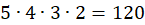 Na pierwszym miejscu może stać jedna z liczb: 2, 4, 6, 8 lub 9 – 5 możliwości, na drugim miejscu może stać każda z liczb, oprócz tej, która stoi na pierwszym miejscu – 4 możliwości, na trzecim, każda poza tymi stojącymi na pierwszym i drugim miejscu – 3 możliwości, a na 4 miejscu jedna z dwóch pozostałych liczb taka, która nie stoi na pierwszym, drugim lub trzecim miejscu – 2 możliwości.