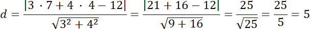 Odległość punktu P(x0, y0) od prostej l o równaniu ogólnym: Ax + By + C = 0 wyraża się za pomocą wzoru: