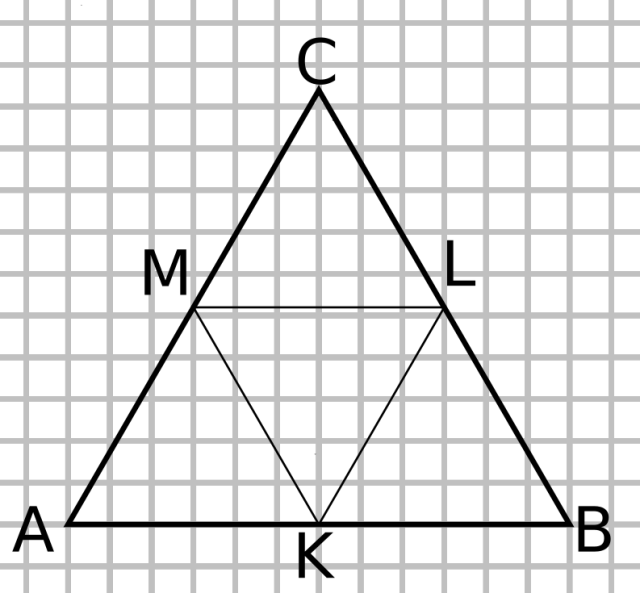 W tym zadaniu musisz podzielić trójkąt równoboczny na cztery mniejsze figury, łącząc środki jego boków i nazwać otrzymane figury, a potem porównać sumy długości boków trójkąta i jednej z jego mniejszych części. Trójkąt ma bok długości .