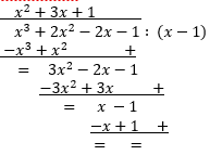Skoro liczba a jest pierwiastkiem wielomianu w, to dzieli się on przez dwumian x - a bez reszty. Dokonujemy dzielenia przez ten dwumian w następujący sposób. Pierwszy od lewej wyraz wielomianu kwadratowego dzielimy przez pierwszy wyraz podanego dwumianu. Następnie mnożymy go przez dzielnik x - 1 i wynik podpisujemy pod dzielną i odejmujemy go od niej poprzez dodanie wielomianu o przeciwnych współczynnikach. Otrzymujemy pierwszą resztę z dzielenia w ten sposób. Powtarzamy opisaną procedurę, dopóki nie otrzymamy wielomianu stopnia niższego niż dwumian, przez który dzielimy. Następnie wyznaczamy miejsce zerowe trójmianu kwadratowego Korzystając z delty. Przestawiamy wielomian w postaci czynników nierozkładalnych zapisując w funkcji kwadratową w postaci iloczynowej.