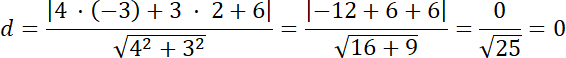 Odległość środka okręgu od prostej jest równa zeru, zatem prosta przechodzi przez środek okręgu i ma dwa punkty wspólne z okręgiem.