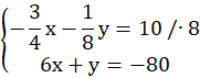 Pomnóż pierwsze równanie przez 8, aby otrzymać przy niewiadomej x liczby przeciwne, a następnie dodaj do siebie równania.