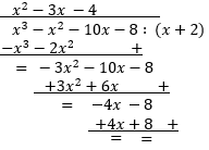 Skoro liczba a jest pierwiastkiem wielomianu w, to dzieli się on przez dwumian x - a bez reszty. Dokonujemy dzielenia przez ten dwumian w następujący sposób. Pierwszy od lewej wyraz wielomianu kwadratowego dzielimy przez pierwszy wyraz podanego dwumianu. Następnie mnożymy go przez dzielnik x + 2 i wynik podpisujemy pod dzielną i odejmujemy go od niej poprzez dodanie wielomianu o przeciwnych współczynnikach. Otrzymujemy pierwszą resztę z dzielenia w ten sposób. Powtarzamy opisaną procedurę, dopóki nie otrzymamy wielomianu stopnia niższego niż dwumian, przez który dzielimy. Następnie wyznaczamy miejsce zerowe trójmianu kwadratowego Korzystając z delty. Przestawiamy wielomian w postaci czynników nierozkładalnych zapisując w funkcji kwadratową w postaci iloczynowej.