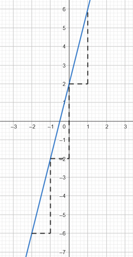zauważ, że przecina ona oś OY w punkcie (0,2), a wzrost argumentu o jedną jednostkę odpowiada wzrostowi funkcji o cztery jednostki i przedstaw to w układzie współrzędnych.
