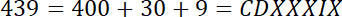 Liczba 439 jest sumą liczb 400 (CD), 30 (XXX), 9 (IX).