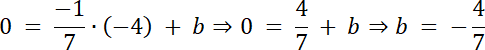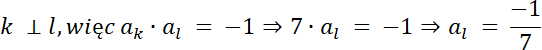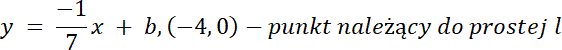 W tym zadaniu musisz skorzystać z warunku prostych prostopadłych, aby wyznaczyć współczynnik kierunkowy prostej l, a następnie na podstawie punktu: o odciętej–4, czyli (–4,0) wyznacz wartość współczynnika b.