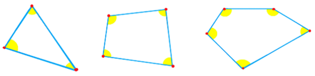 Oznacz podane figury według wzoru: wierzchołki na czerwono, boki na niebiesko i kąty na żółto.