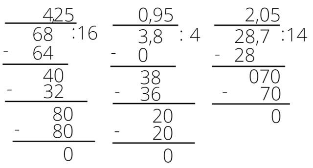 Dzielisz tak samo, jak w przypadku liczb naturalnych, lecz musisz postawić przecinek w wyniku bezpośrednio nad przecinkiem w dzielnej. Jeśli w dzielnej nie ma już liczby, to dopisujesz 0 do reszty i postępujesz w ten sposób, dopóki nie otrzymasz reszty zero.
