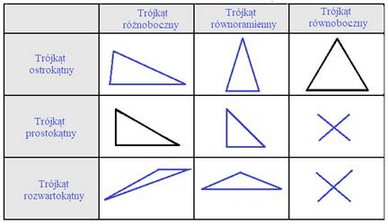 Uzupełnij tabelkę rysunkami trójkątów tak, aby pasowały do opisu. Jeśli nie jest możliwe narysowanie jakiegoś trójkąta, wstaw krzyżyk.