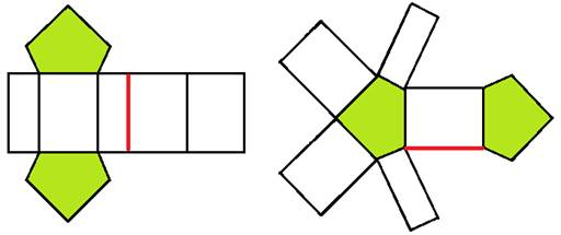 Zauważ, że podstawą tego graniastosłupa jest pięciokąt, zatem na siatkach musisz pokolorować pięciokąty, natomiast wysokością może być każda, dowolna dłuższa krawędź ściany bocznej (prostokąta).