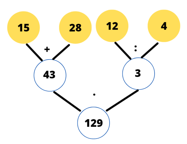 (15 + 28) ∙ (12 : 4) = 43 ∙ 3 = 129