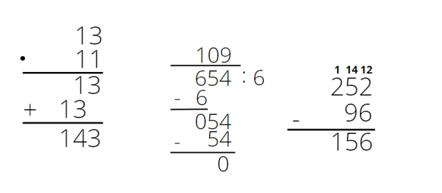G. 13 ∙ 11 + 654 : 6 – 96 = 143 + 109 – 96 = 252 – 96 = 156