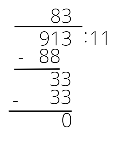 913 : 11 = 83