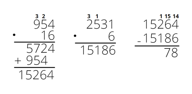 A. 16 ∙ 954 – 6 ∙ 2531 = 15264 – 15186 = 78