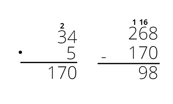 C. 268 – 5 ∙ 34 = 268 – 170 = 98