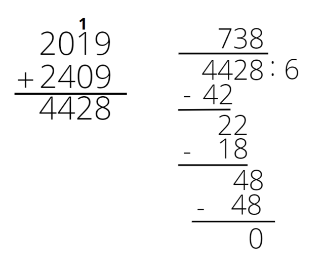 (2019 + 2409) : 6 = 4428 : 6 = 738