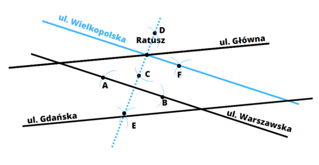 Teraz narysuj prostą prostopadłą do przerywanej linii. Wbij nóżkę cyrkla w punkt z Ratuszem i zaznacz dowolne dwa łuki na prostej przerywanej. Zaznacz punkty C i D. Nie zmieniając rozwartości cyrkla, zaznacz łuki z punktów C i D. Punkt przecięcia łuków (punkt F) połącz z ratuszem. Otrzymasz w ten sposób prostą równoległą do ulicy Warszawskiej.