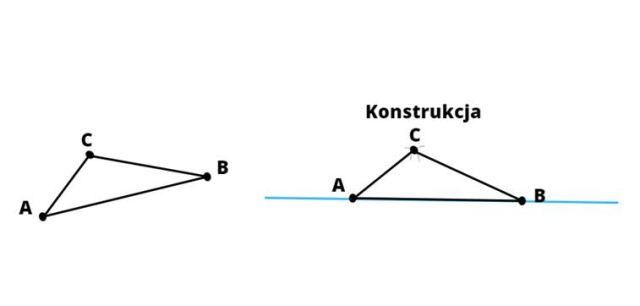 Narysuj prostą. Przenieś za pomocą cyrkla na tę prostą jeden z boków (bok AB). Następnie zmierz rozwartością cyrkla długość drugiego boku i wbij nóżkę cyrkla do jednego końca boku AB. Nie zmieniając rozwartości cyrkla, narysuj łuk. Następnie zmierz za pomocą cyrkla trzeci bok. Wbij nóżkę cyrkla do drugiego końca boku AB. Narysuj łuk. W punkcie przecięcia łuków będzie znajdować trzeci wierzchołek trójkąta, który trzeba połączyć z pozostałymi dwoma.