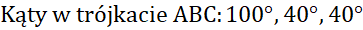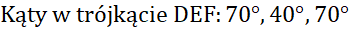 Określ, który z podanych trójkątów jest równoramienny. Trójkąt ABC ma miary kątów 100° i 40°, a trójkąt DEF – 70° i 40°.