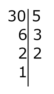 Rozłożenie danej liczby na czynniki pierwsze oznacza zapisanie jej w postaci iloczynu liczb pierwszych. Aby znaleźć czynniki pierwsze, należy daną liczbę dzielić przez liczby pierwsze, aż do otrzymania liczby 1. Rozkład liczby 30 na czynniki pierwsze wygląda następująco: