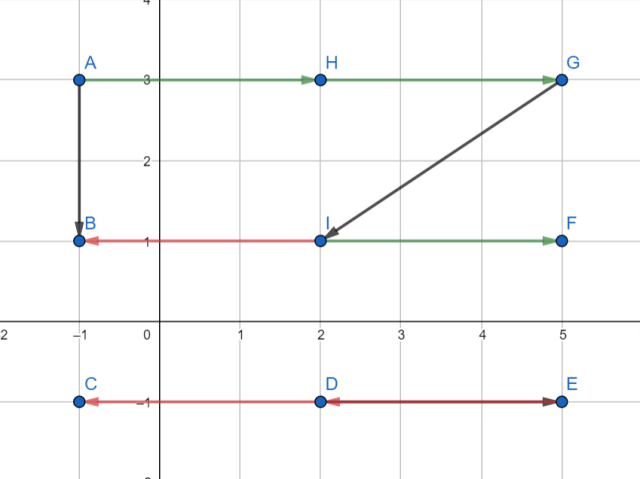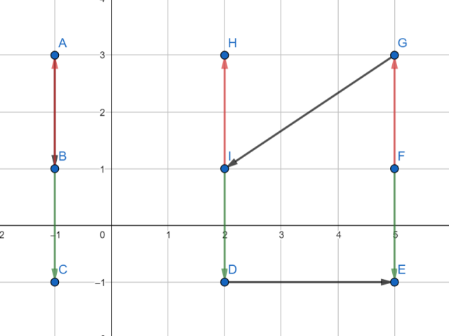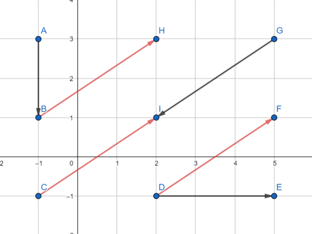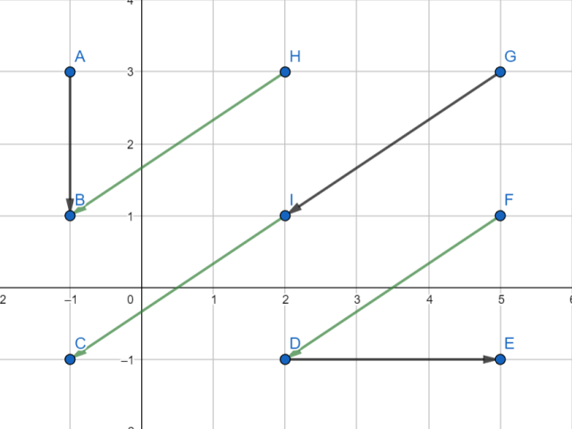 W tym zadaniu dla każdego z podanych w treści wektorów musisz znaleźć po trzy wektory równe (zgodny kierunek, zwrot i wartość) oraz trzy przeciwne (zgodny kierunek i wartość, przeciwny zwrot). Przy wyznaczaniu wektorów możesz posługiwać się tylko punktami od A do I.