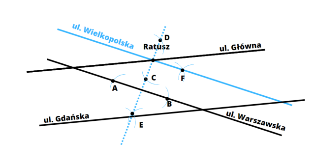 Teraz narysuj prostą prostopadłą do przerywanej linii. Wbij nóżkę cyrkla w punkt z Ratuszem i zaznacz dowolne dwa łuki na prostej przerywanej. Zaznacz punkty C i D. Nie zmieniając rozwartości cyrkla, zaznacz łuki z punktów C i D. Punkt przecięcia łuków (punkt F) połącz z ratuszem. Otrzymasz w ten sposób prostą równoległą do ulicy Warszawskiej.
