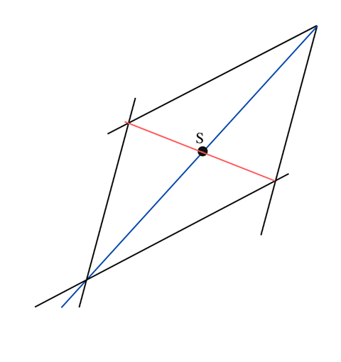 Poprowadź prostą z wierzchołka kąta przechodzącą przez punkt S. Następnie dorysuj proste równoległe do ramion kąta, by utworzyć równoległobok. Przekątne równoległoboku przecinają się w połowie. Odcinek niebieski to jedna z przekątnych, a odcinek pomarańczowy to przekątna, której końce leżą na ramionach kąta, a środkiem jest punkt S.