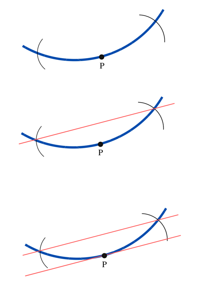 Najpierw narysuj dwa łuki (ustaw cyrkiel na punkcie P) oraz dorysuj prostą przechodzącą przez przecięcia łuków z okręgiem. Prosta do niej równoległa to styczna do okręgu w punkcie P.
