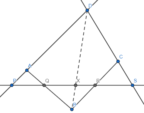 Prowadzimy pomocniczy odcinek BD, który przecina PS w punkcie X. Stosujemy twierdzenie Menelaosa dla trójkąta ABD: