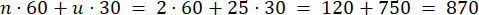Aby wykonać zadanie, należy do wyrażenia n·60+u·30 podstawić wartości dla n = 2 i u = 25 i wykonać obliczenia. Obliczona wartość oznacza sumę zakupionych biletów.