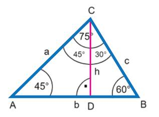 Zauważ, że wysokość dzieli trójkąt na dwa trójkąty o kątach: 30°, 60°, 90° i 45°, 45°, 90°. Aby obliczyć długości pozostałych trójkątów skorzystaj z własności tych trójkątów: