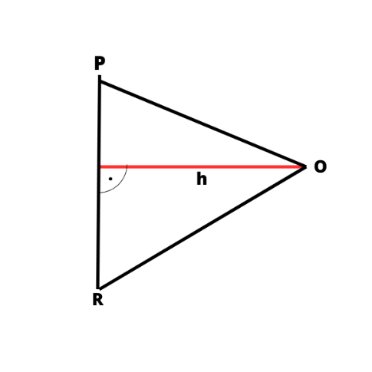 Na końcu odcinka h zaznacz punkt O. Skoro odcinek h jest wysokością padającą na bok PR, to jest on do niego prostopadły. Mając narysowaną wysokość z prostopadłą do niej podstawą, wystarczy zamknąć trójkąt i podpisać wierzchołki.