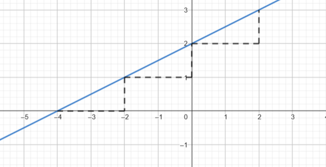 zauważ, że przecina ona oś OY w punkcie (0,2), a wzrost argumentu o dwie jednostki odpowiada wzrostowi funkcji o jedną jednostkę i przedstaw to w układzie współrzędnych.