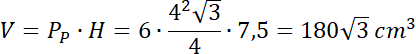 Wyznacz objętość graniastosłupa prawidłowego sześciokątnego o krawędzi podstawy 4 cm, którego pole powierzchni bocznej jest równe 180 cm2.