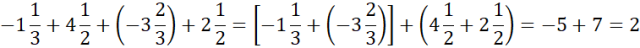 Pamiętaj, dodawanie jest przemienne i łączne – połącz ze sobą liczby mieszane, których mianowniki są takie same. Zwróć uwagę, suma liczb ujemnych jest liczbą ujemną, a dodatnich – dodatnią. Następnie od większej liczby odejmij wartość bezwzględną mniejszej.