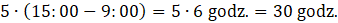 Odejmij godzinę początkową od godziny końcowej i pomnóż uzyskany wynik przez liczbę dni od poniedziałku do piątku.