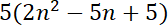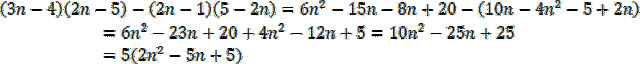 Wymnóż sumy algebraiczne, czyli pomnóż każdy wyraz znajdujący się w jednym nawiasie przez każdy wyraz z drugiego nawiasu, w iloczynie dwóch nawiasów, a następnie zredukuj wyrazy podobne, czyli dodaj/odejmij jednomiany podobne. Na koniec wyłącz liczbę 5 przed nawias w powstałym wyrażeniu.