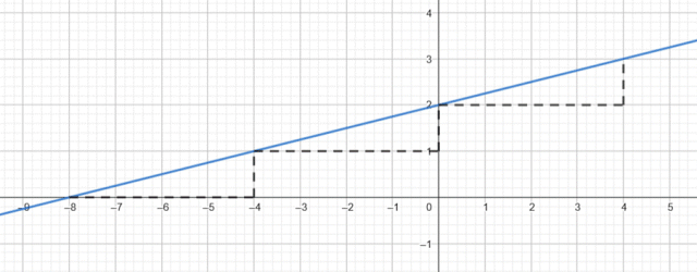 zauważ, że przecina ona oś OY w punkcie (0,2), a wzrost argumentu o cztery jednostki odpowiada wzrostowi funkcji o jedną jednostkę i przedstaw to w układzie współrzędnych.