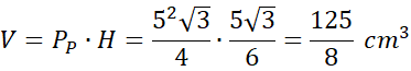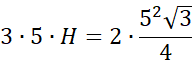 Ze wzoru na pole boczne graniastosłupa – pole 3 prostokątów o wymiarach 5 na H i pola trójkąta równobocznego o krawędzi długości