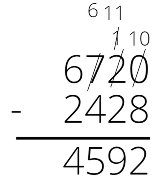 Zapisz liczby jedna pod drugą. Odejmuj kolumnami. Jeśli cyfra górna jest mniejsza od dolnej, to dodaj do niej 10, a cyfrę po lewej stronie zmniejsz o 1 i wykonaj odejmowanie na nowo powstałych liczbach. Jeśli nowo napisana liczba jest mniejsza od dolnej cyfry, to powiększ ją o 10, a następną cyfrę po lewej zmniejsz o 1.